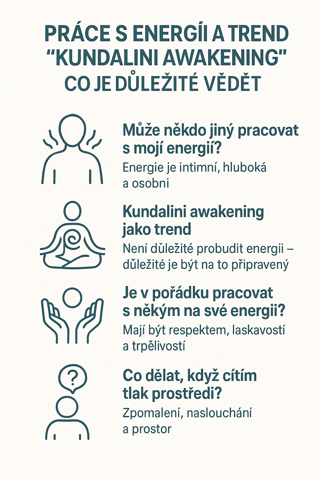 V posledních letech se stále častěji objevují různé energetické terapie, kurzy a lekce, které slibují práci s energií, probouzení kundalini nebo rychlou duchovní transformaci. Mnoho lidí se do podobných praxí pouští ze zvědavosti, touhy po změně nebo proto, že je to "v módě". A právě proto je dobré zastavit se a položit si několik důležitých otázek.